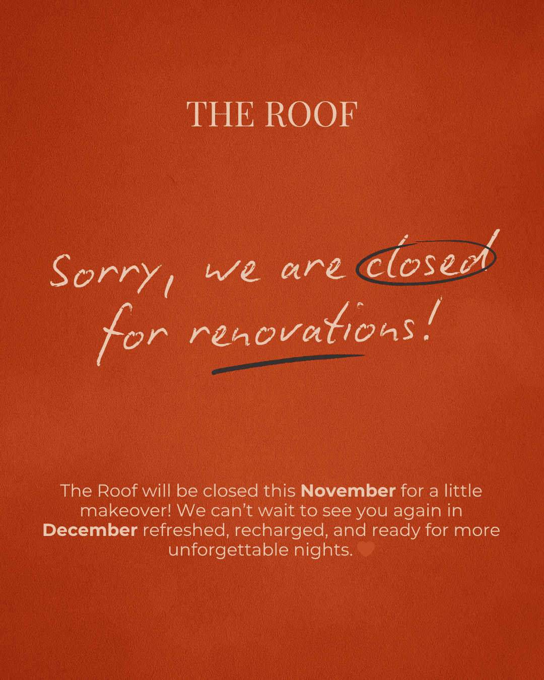 The Roof will be undergoing renovations throughout November, a long-awaited step as we prepare for the next chapter of our journey.