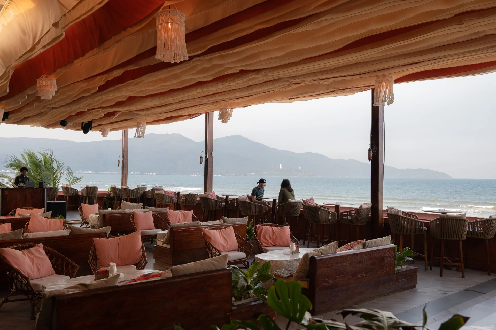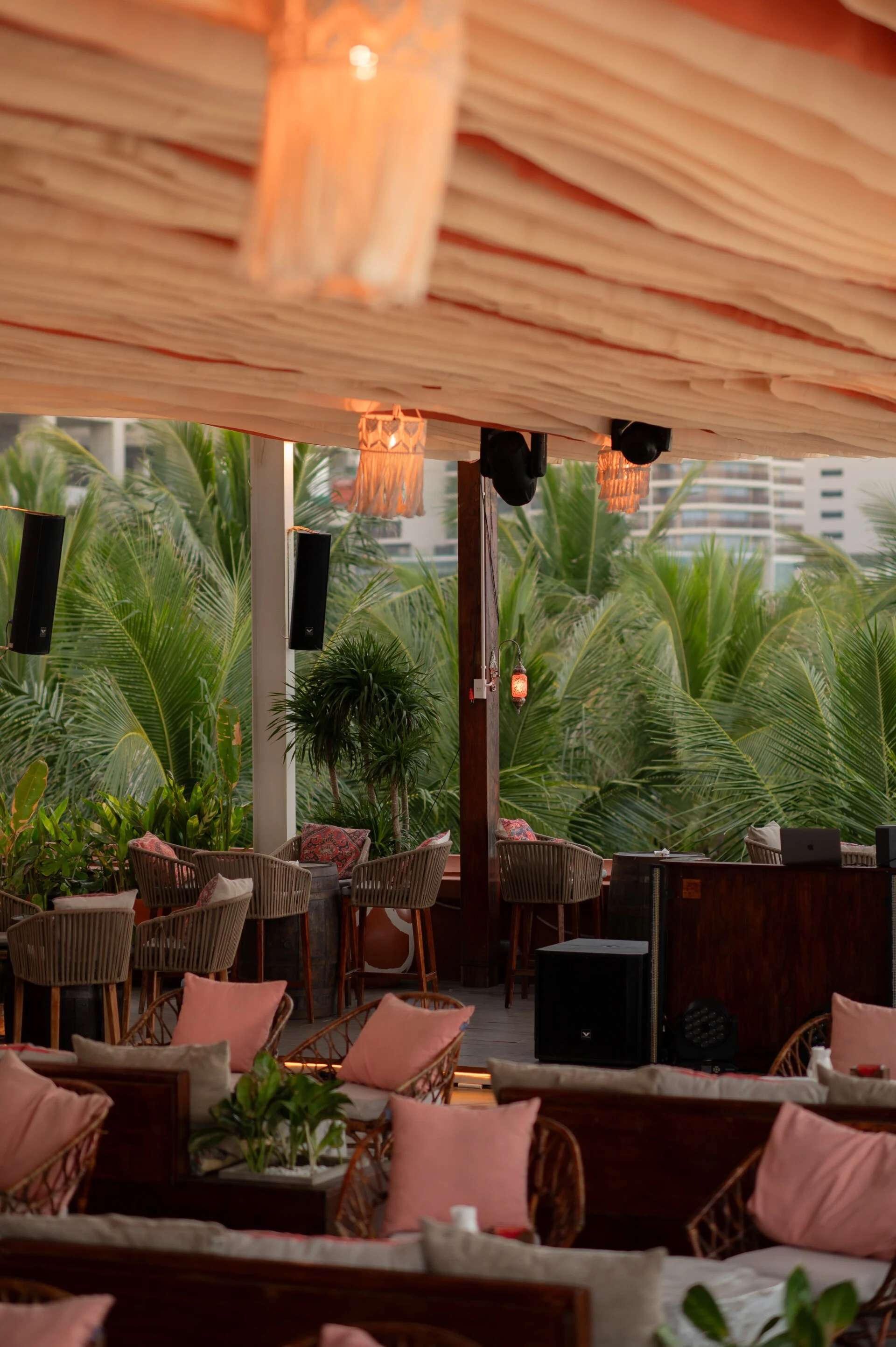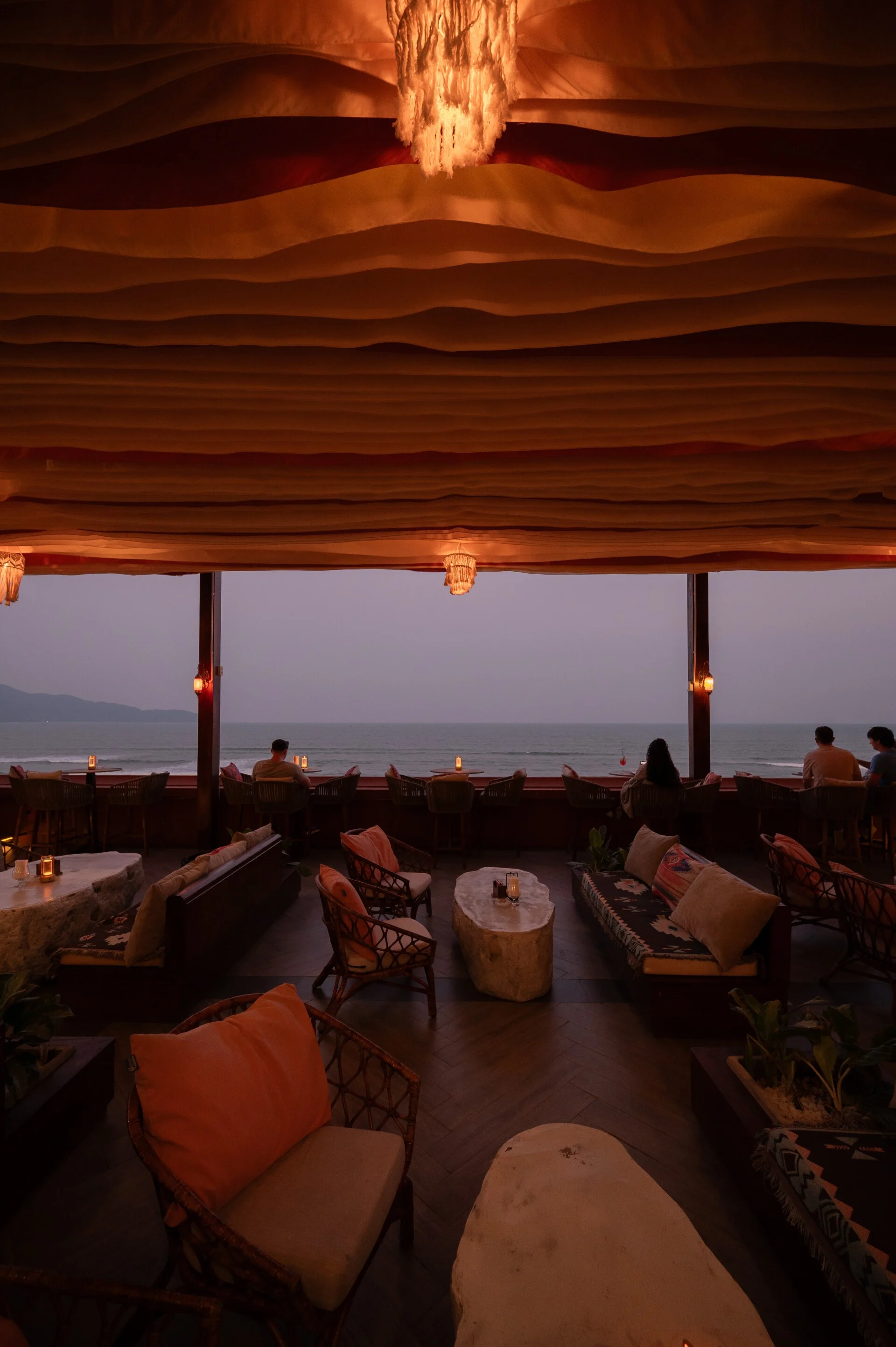 The Vibe: Soft, layered fabric ceilings and handcrafted fringe lamps create a warm, golden glow that mirrors the sunset.